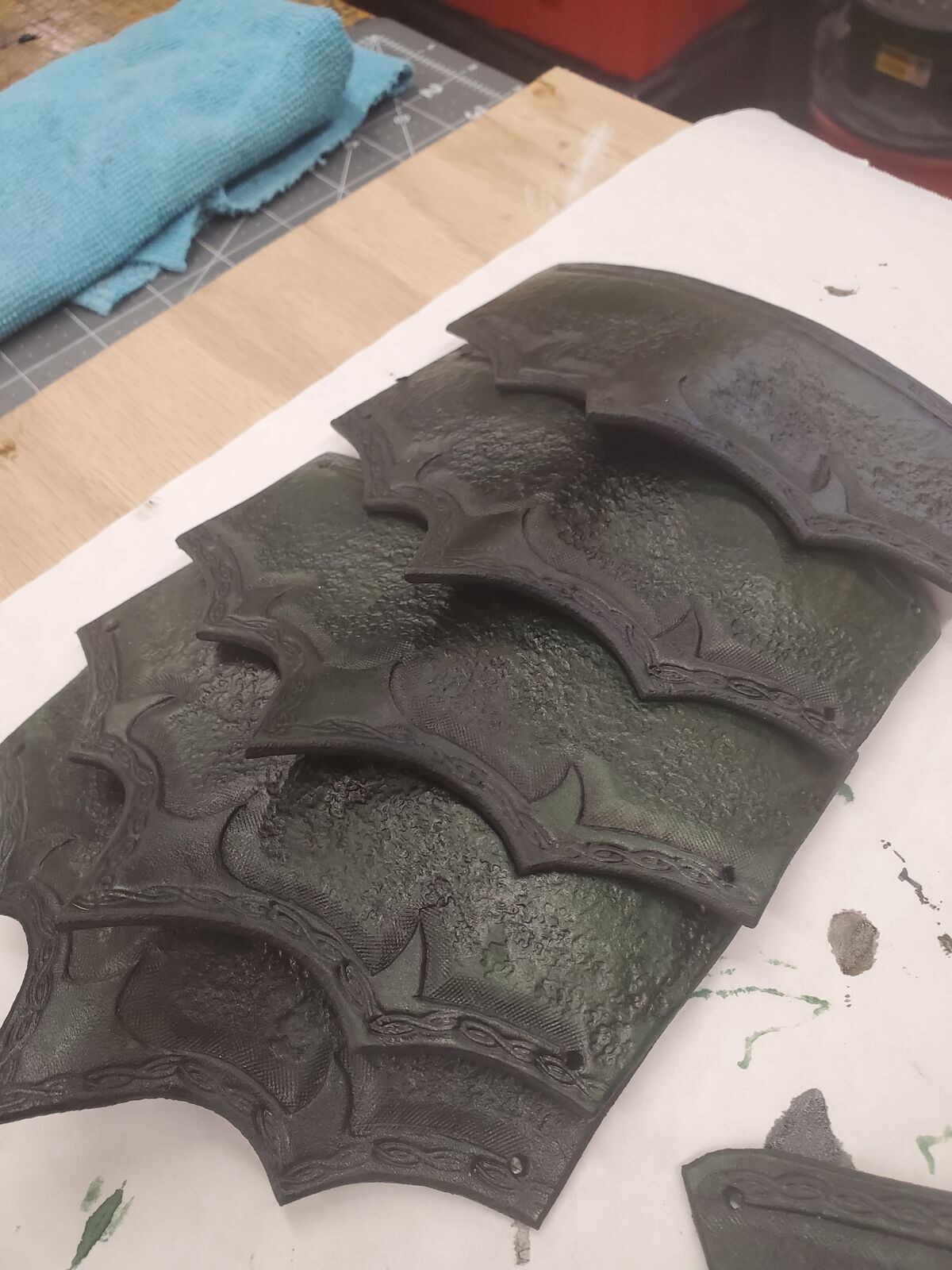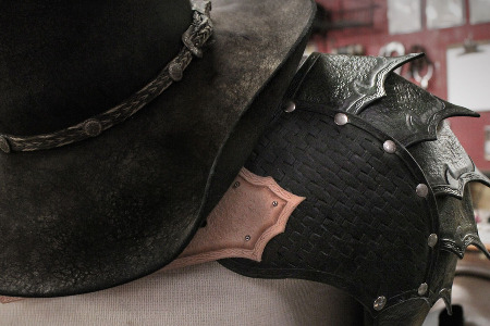 Time to make that dream a reality. Why not have a custom hand-made leather armor made to your body and your style? We can work with you on concepts, colors and designs. This is just a sample of an unfinished hand tooled leather shoulder spaulder. Just let your imagination go and make it reality!